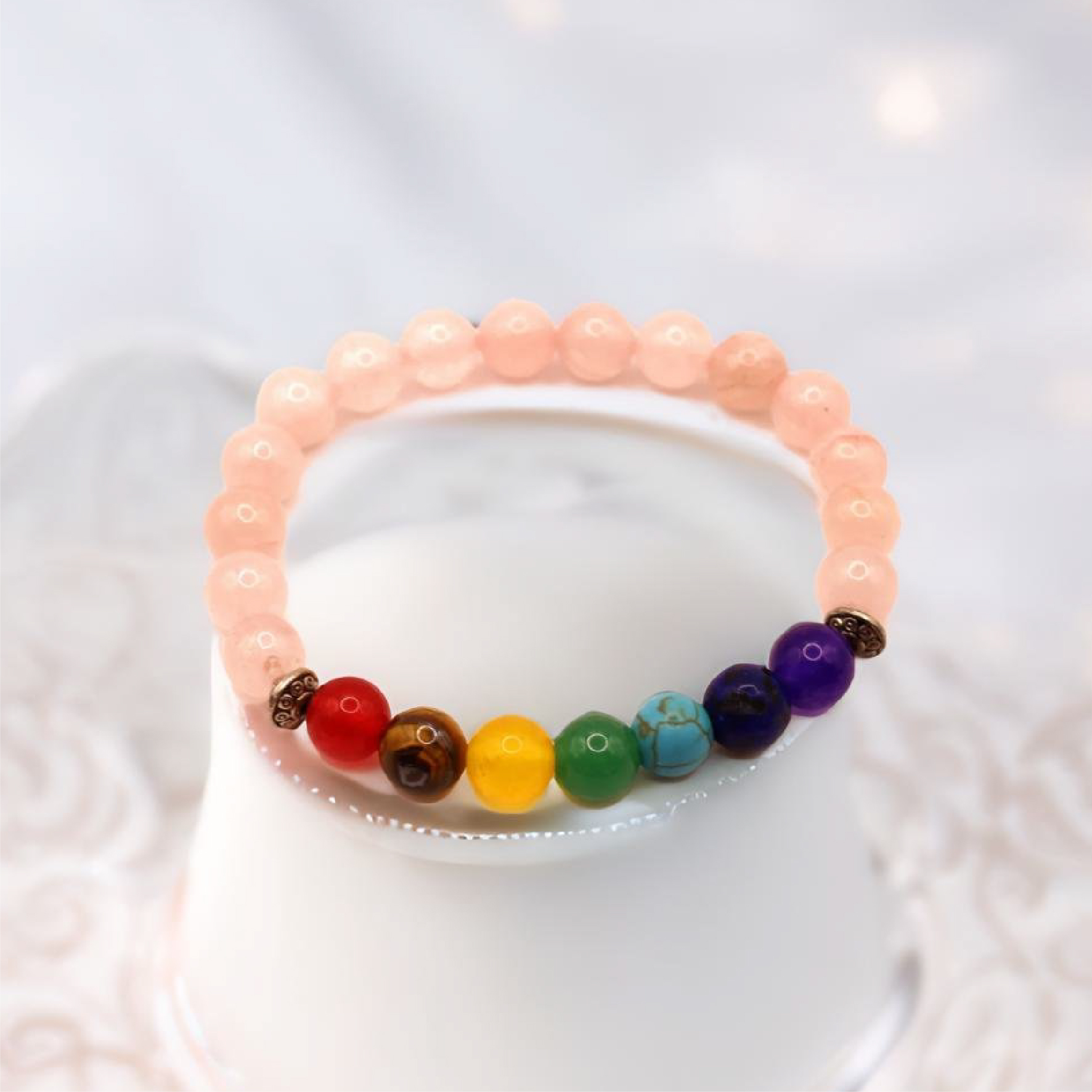 The natural pink stones in this bracelet are known for their calming and nurturing energy. Pink stones, especially rose quartz, are often associated with love, compassion, and emotional healing. This bracelet helps to open the heart chakra, promoting peace, emotional well-being, and self-love. Wear it to enhance your energy and experience a sense of calm and healing.