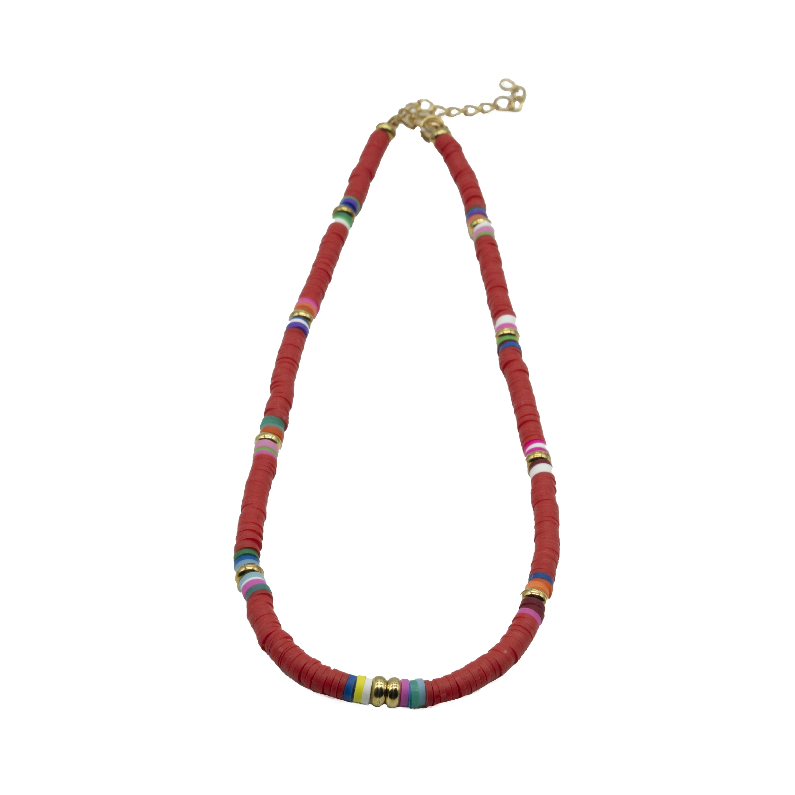 This Bohemian-inspired necklace features vibrant red Heishi beads, offering a bold, eye-catching statement. The smooth, evenly spaced beads create a sleek and modern look that’s perfect for adding a pop of color to any outfit. Whether you wear it on its own or layer it with other accessories, this necklace brings a lively touch to your wardrobe. A perfect choice for those who love unique, colorful pieces that enhance everyday style.