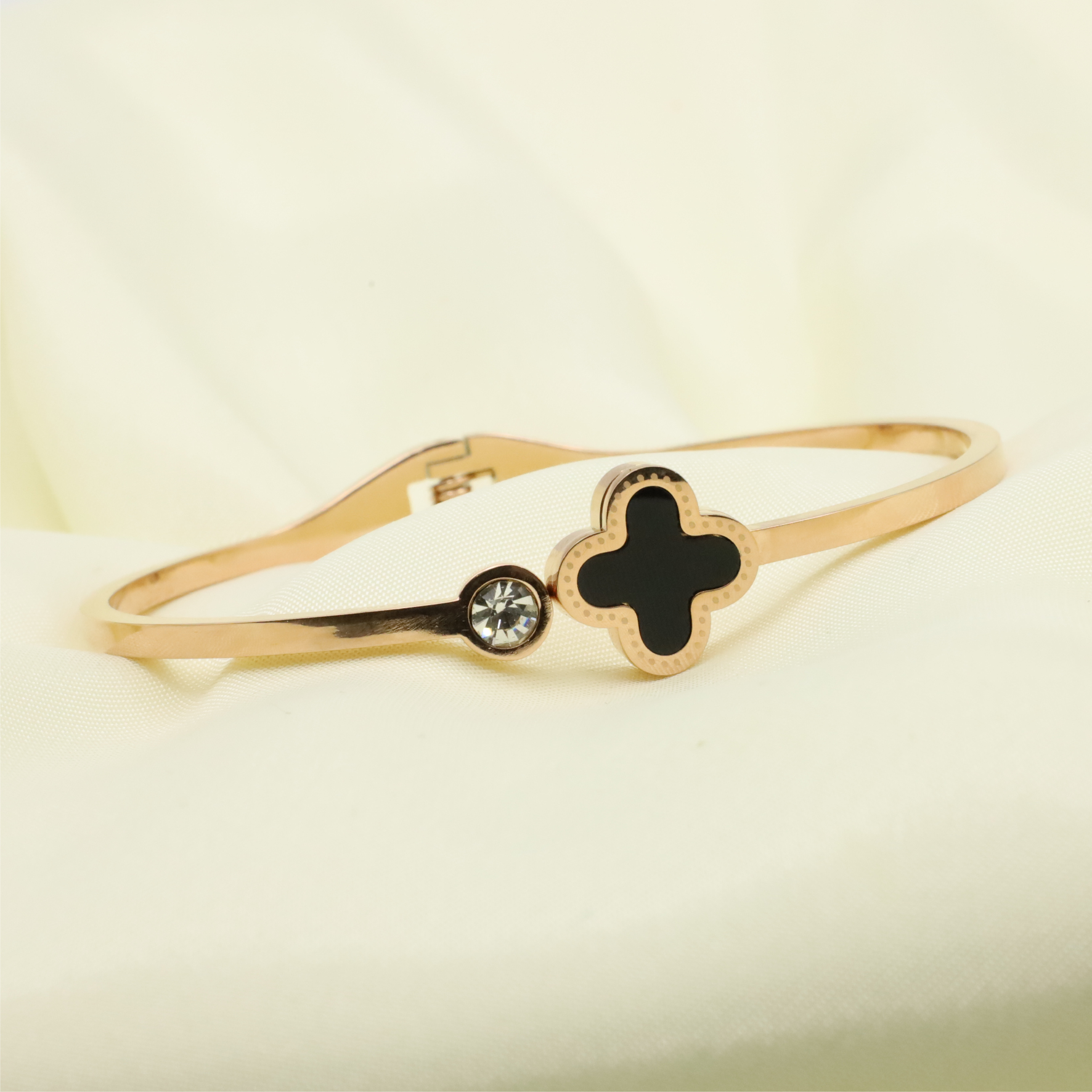This handcuff combines timeless beauty with meaningful symbolism. The four-leaf clover motif represents good fortune, while the rose gold finish adds warmth and sophistication. Its refined design makes it suitable for both casual and formal wear, adding a subtle charm to your outfit. Whether worn on its own or layered with other bracelets, it’s a perfect way to express your style.