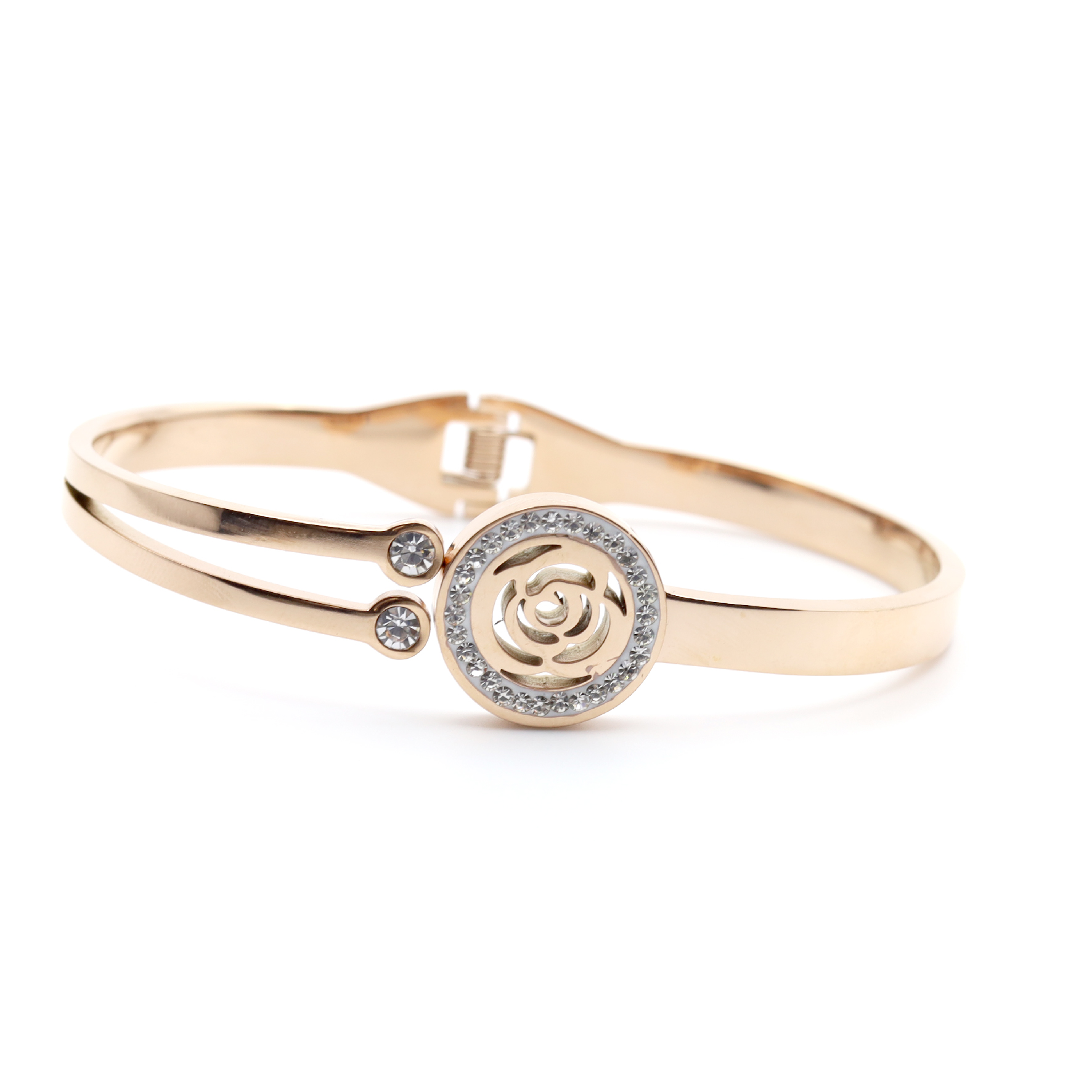 This rose gold handcuff showcases a beautiful rose design, adding a soft and romantic touch to your wrist. The intricate detailing and warm rose gold finish make it a perfect accessory to enhance both everyday wear and special occasions with an elegant, feminine appeal.