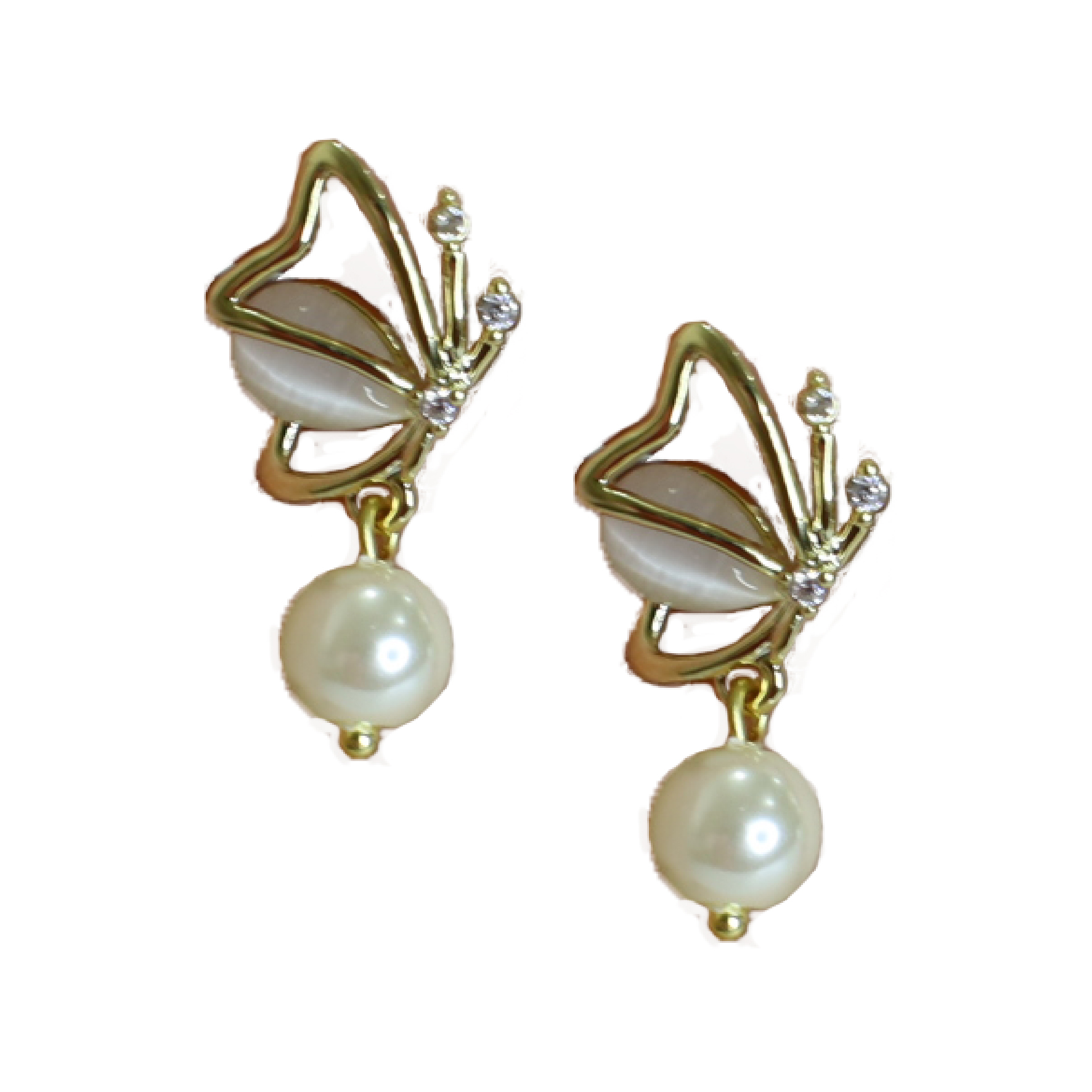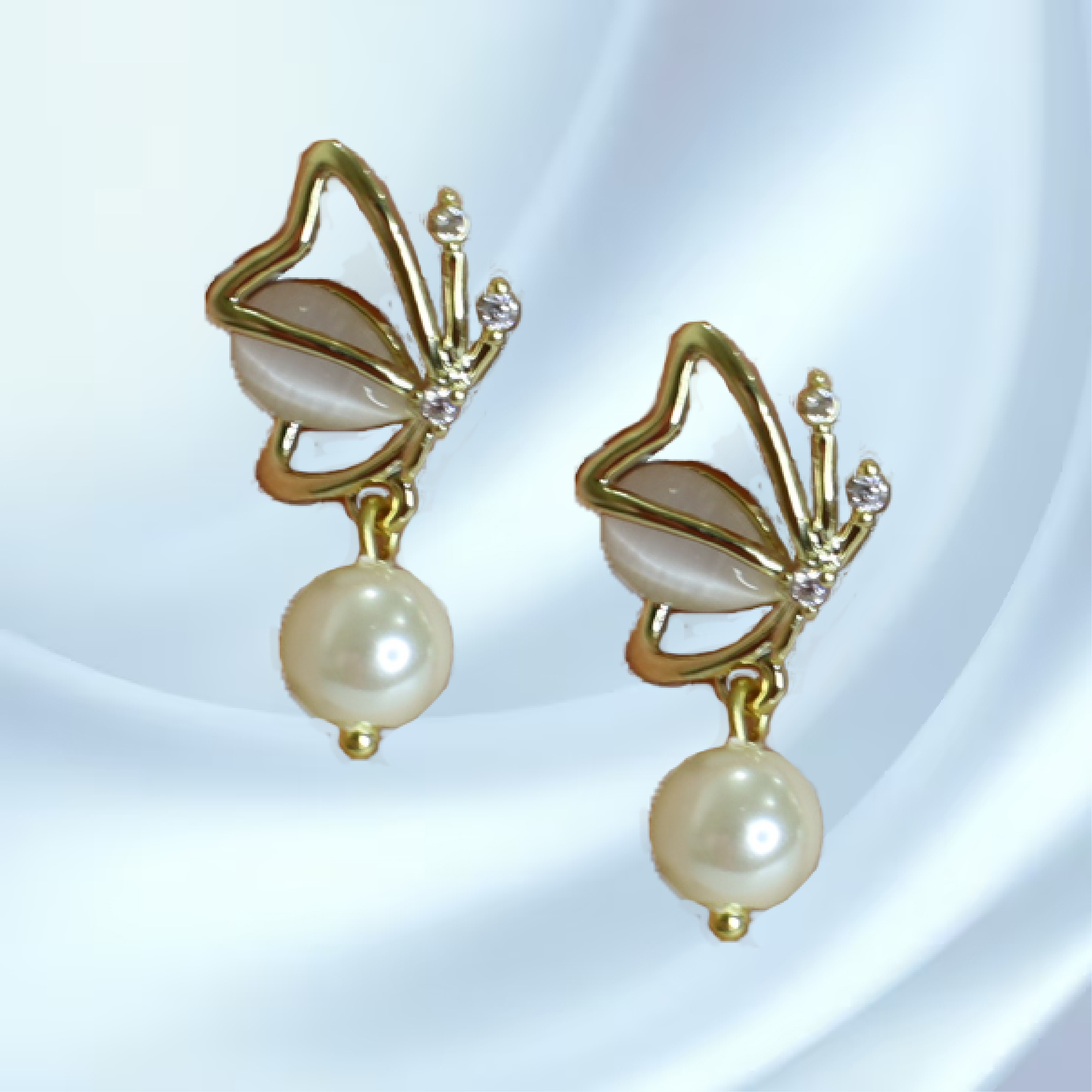 These earrings feature a stunning butterfly pendant adorned with lustrous pearls, symbolizing transformation, beauty, and new beginnings. The combination of the butterfly and pearls creates a refined yet whimsical look, making these earrings perfect for both casual and formal occasions. Whether worn alone or as part of a layered look, they add an elegant touch to any ensemble.