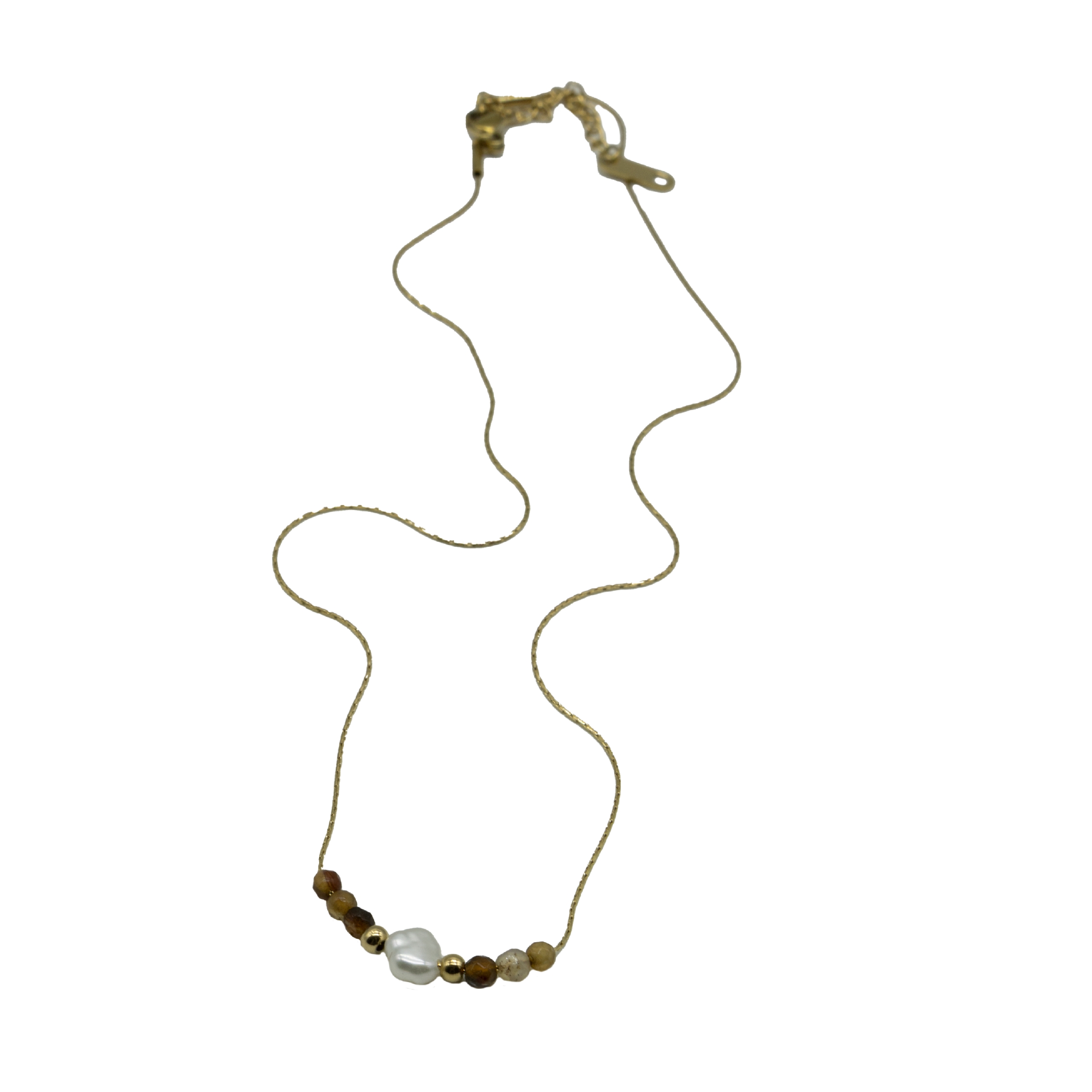 A beautiful combination of warm brown beads and classic pearls, this chain adds a touch of elegance and sophistication to any look. Its earthy tones offer versatility, making it perfect for both day and evening wear. Elevate your style effortlessly with this refined accessory.
