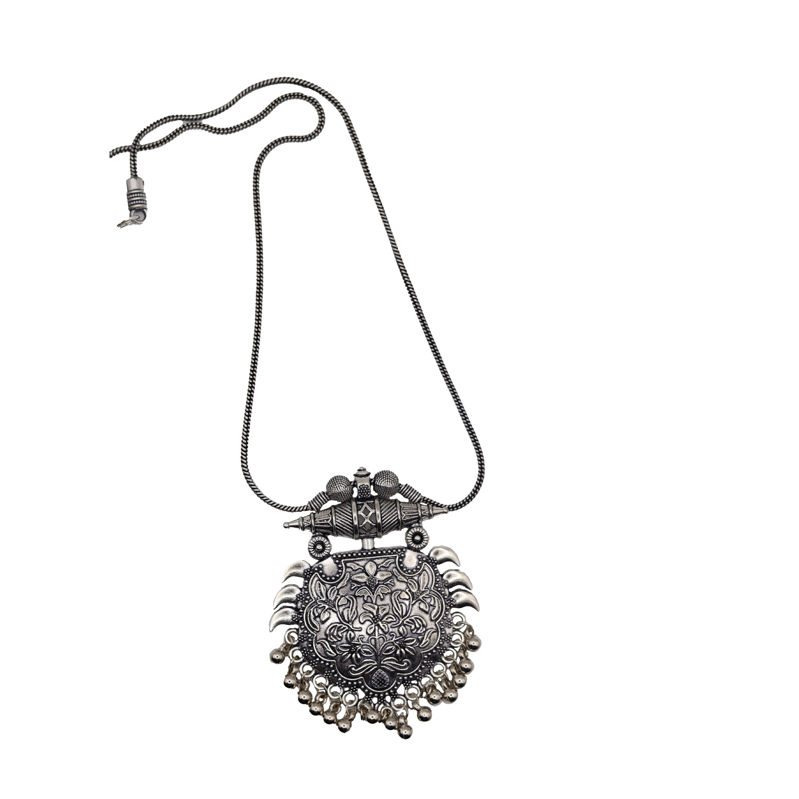 This German silver round latkan features a traditional and elegant design, perfect for adding a touch of charm to your attire. The circular shape and delicate craftsmanship make it an ideal accessory to complement ethnic wear, offering a blend of timeless beauty and cultural flair.
