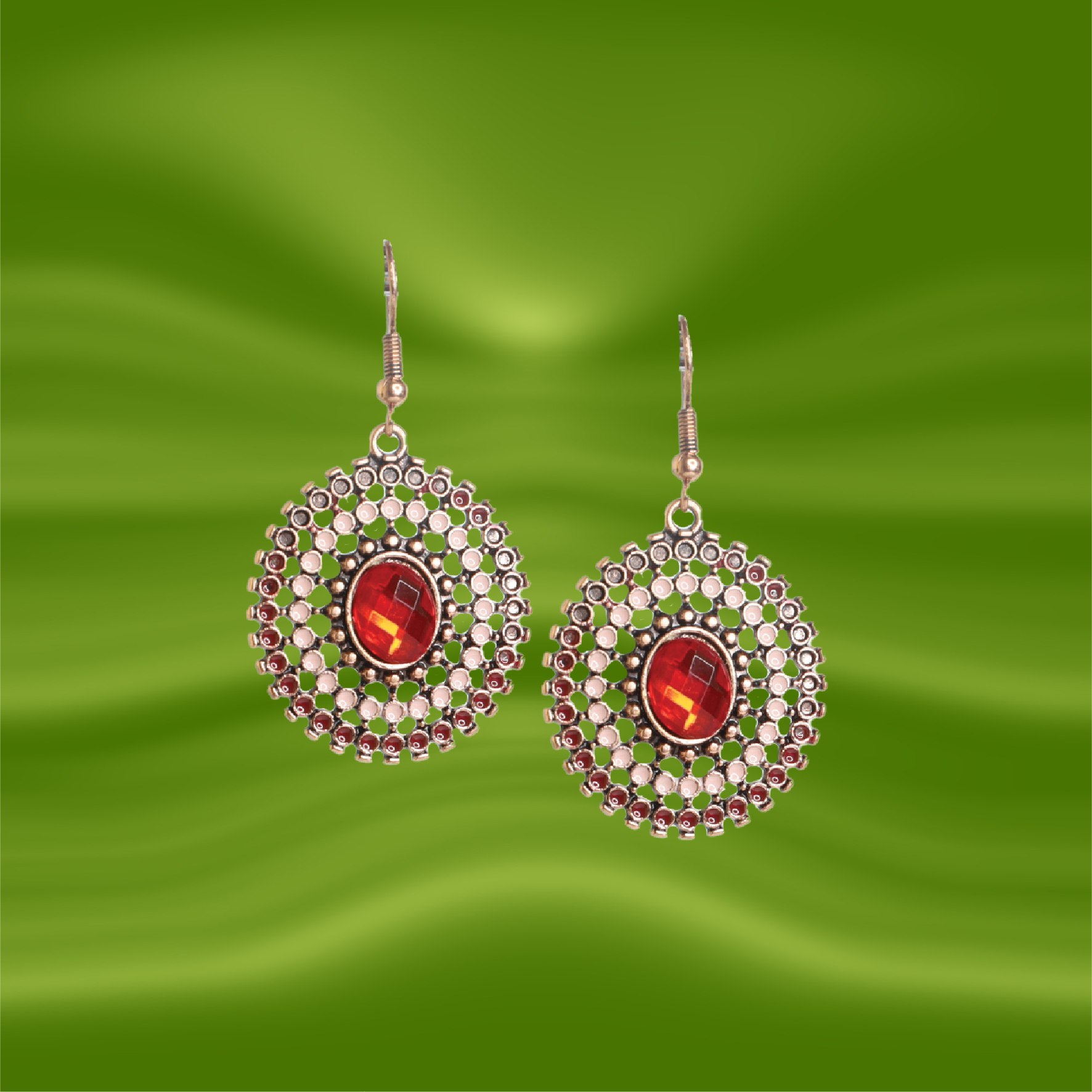 These earrings feature a stunning sunburst design, with vibrant scarlet hues that capture the light and add a fiery, energetic touch. The combination of bold red tones and intricate patterns creates a striking look that embodies strength and confidence. Whether worn for a special event or an everyday outing, these earrings bring an eye-catching flair to any ensemble.